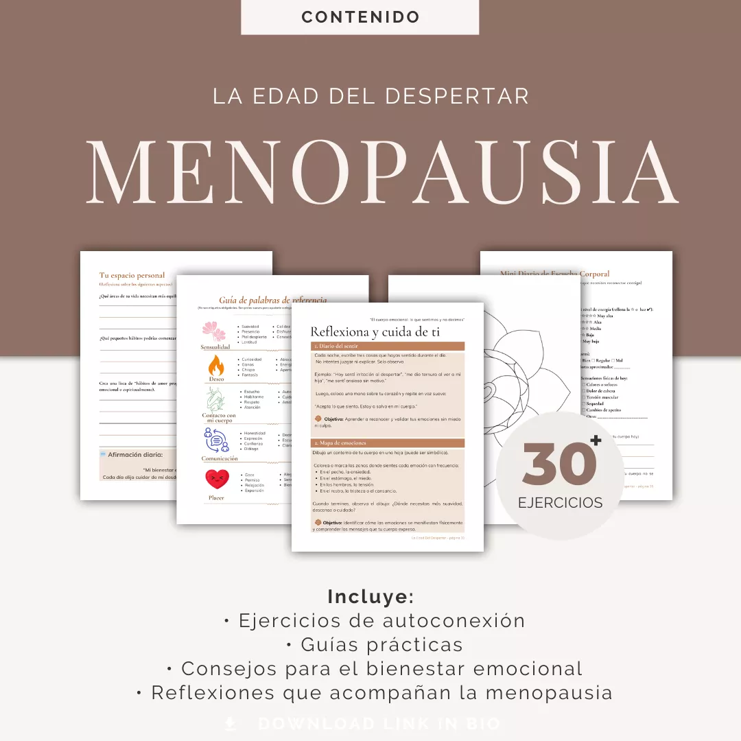 Como bono incluido, también recibirá el Cuaderno de Ejercicios en PDF, diseñado para acompañarla paso a paso en este proceso. Podrá imprimirlo y repetir los ejercicios cuantas veces quiera, reforzando su aprendizaje y conexión con esta nueva etapa de su vida.